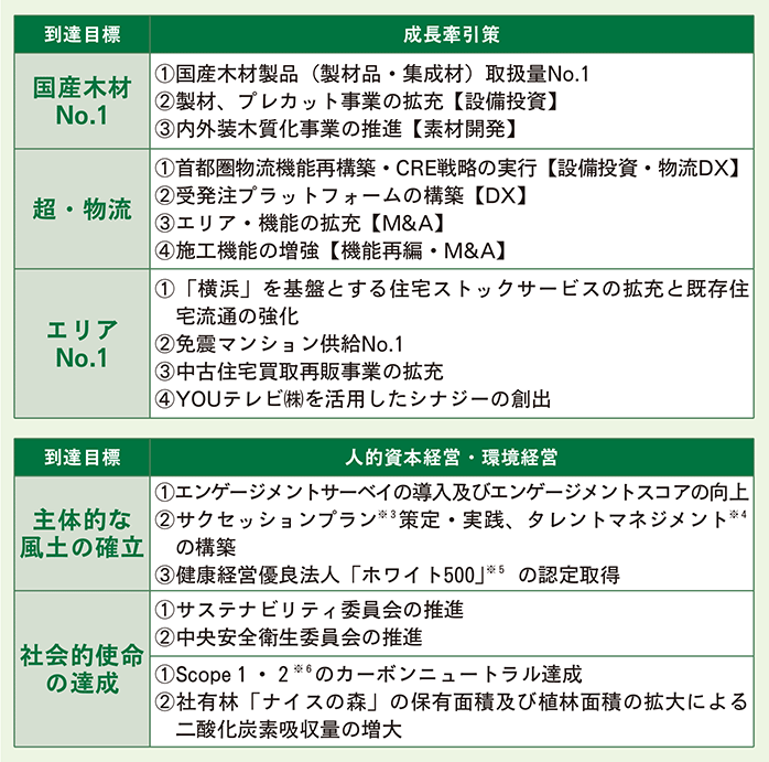 「国産木材№1」に向けては、国産木材製品(製材品・集成材)の取扱量の強化、設備投資による製材やプレカット事業の拡充、素材開発による内外装木質化事業の推進を図ります。