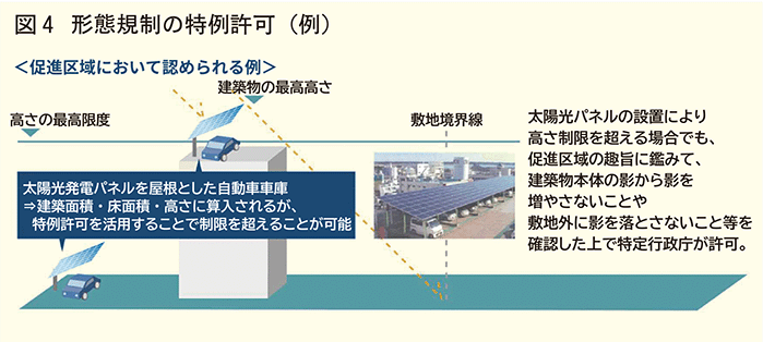 ガイドライン案では、促進区域において建築士による再エネ導入効果の説明を義務付ける措置が示されたほか、建築基準法の形態規制の合理化により、促進計画に定める特例適用要件に適合して再エネ設備を設置する場合に、高さ制限や容積率制限、建蔽率制限について特例が認められること等が定められています(図4)。