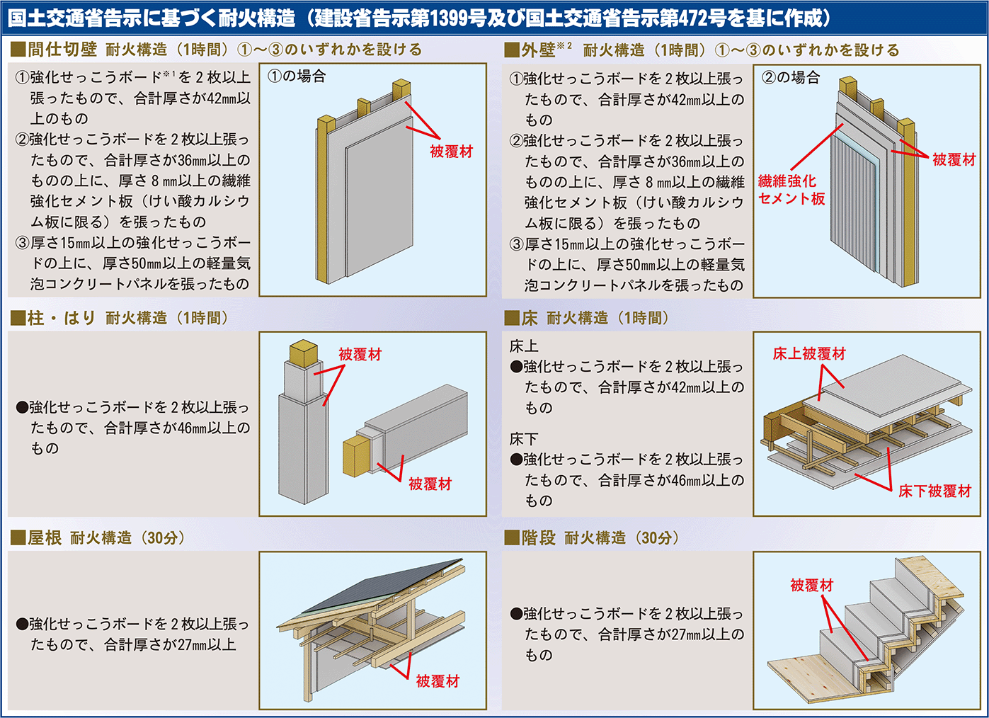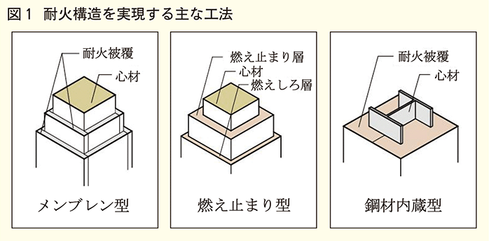 耐火建築物を実現する方法には、国土交通省の告示に基づく仕様や、建築基準法令で要求する性能に適合する構造として指定性能評価機関による性能評価及び大臣認定を受けた仕様を採用する方法があります。構造としては、木材をせっこうボードなどで耐火被覆する「メンブレン型」、木材を難燃処理剤やモルタルなどで燃え止まり層を形成する「燃え止まり型」、構造体力上主要な部分に使用した鋼材を木材で防火被覆する「鋼材内蔵型」の三つが主となります(図1)。特に「メンブレン型」では、木造軸組工法や枠組壁工法、CLTパネル工法における主要構造部を耐火構造にすることができ、国土交通省の告示もこの仕様となっています(下図)。