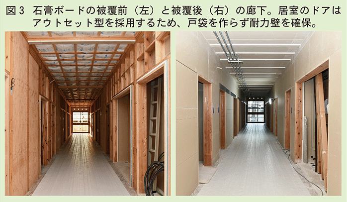 こうして石膏ボードを多く使用することにより、一般的な木造住宅や準耐火構造と比べて建物の総重量が増加するため、耐力壁の調整も必要となります。特に、L字型に配置された本建物では間口が比較的狭く、廊下側や外壁側で耐力壁を十分に配置することが困難であったため、居室のドアは引き込み型ではなくアウトセット型を採用し、廊下側の耐力壁の確保につなげています。耐力壁には、(一社)日本木造住宅産業協会の高強度耐力壁を採用し、7.5倍から19.2倍の壁倍率の耐力壁を効率的に配置しています。