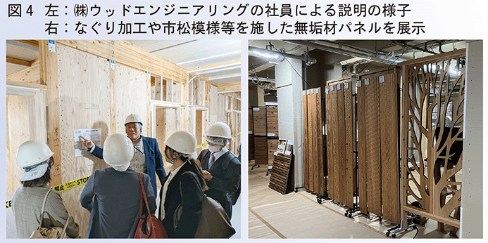 また、共和成産㈱とナイス㈱による、非住宅の内外装木質化を実現するオリジナル木材製品の提案も併せて行われました。特に、3次元加工を施して立体的な意匠を実現した無垢材パネルにはとりわけ注目が集まりました。現場見学会の参加者からは「耐力壁の施工状況を実際に見ることができ、大変勉強になった」「施主の立場として木造を採用する際は相談させてほしい」といった声が聞かれました。