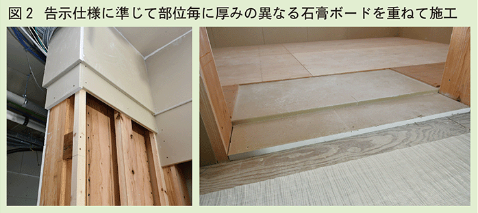 本建物は在来軸組工法による1時間耐火仕様となっています。4階建ての計画であったことから、建築基準法により耐火構造が求められたため、国土交通省の告示仕様に基づき、壁・柱・床・梁等の構造体力上主要な構造部分を強化石膏ボード等で被覆する「メンブレン型」が採用されています。壁や床には厚さ21㎜を二重に、柱や梁には厚さ25㎜と21㎜を重ねて強化石膏ボードを貼るなど、構造体を連続して覆った仕様となっています。