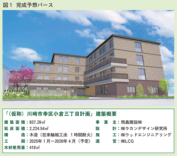 ㈱ウッドエンジニアリングは現在、神奈川県川崎市において木造の有料老人ホーム「(仮称)川崎市幸区小倉三丁目計画」の新築工事を進めています。建築面積が637.29㎡、延床面積が2,224.54㎡の4階建てで、全90室の居室のほか、共用スペースの食堂や機械浴室が設けられています。居室は一部屋当たり13㎡の広さで、入居者が利用しやすい家賃設定を可能とし、より多くの方に利用いただける計画としています。
