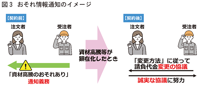 また、労務費へのしわ寄せを防ぐため、資材高騰が生じるおそれがあると認めるときは、請負契約の締結をするまでに受注者から注文者に対して、関連する情報(「おそれ情報」)を必要な情報として通知しなければならないこととしました。この場合、実際に資材高騰が生じたときは、受注者から注文者に対して請負代金の変更協議を申し出ることができ、注文者は当該協議に誠実に応じるよう努めなければならないこととなります。おそれ情報の対象となる事象は、主要な資機材の供給の不足もしくは遅延又は資機材の価格の高騰や、特定の建設工事の種類における労務の供給の不足又は価格の高騰を指します。おそれ情報の通知は見積書の交付時などに行い、メディア記事や公的主体の統計資料といった根拠情報も併せて通知する必要があるほか、発注者が確認したことを記録するため、通知書面やメール等を受発注者双方が保存することが望ましいとされています。