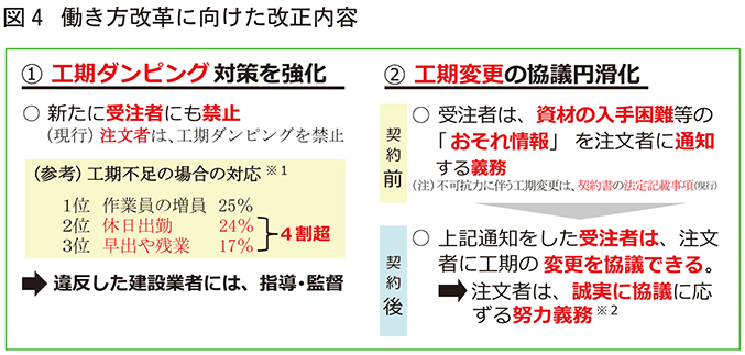 こうした状況を踏まえ、長時間労働を是正し、週休2日を確保していくため、受注者の発意による著しく短い工期による請負契約の締結(工期ダンピング)が禁止されました。また、「しわ寄せ防止」に示した請負代金の変更協議と同様に、資材の入手困難などが生じるおそれがあると認めるときは、受注者から注文者に対して関連する情報を請負契約の締結までに通知しなければならないこととされました。この場合、実際に資材の入手困難などが生じたときは、受注者から注文者に対して工期の変更に関する協議を申し出ることができ、注文者は当該協議に誠実に応じるよう努めなければなりません。