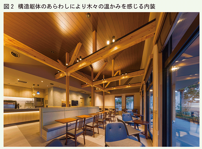 内装では、本店舗が耐火性能の指定を受けないことから、構造躯体をあらわしとしています(図2)。柱・小屋束にはスギ材、梁には梁成に応じてスギ材とレッドウッド材を使い分けて使用しているほか、トラスをイメージしたスギの斜材を意匠的に複数配置しています。加えて、南側の焙煎室から北側の客席スペースに向かって天井が高くなるように勾配がつけられており、一般流通材を用いながら、開放的かつ木々に包まれているような店舗空間を演出しています。
