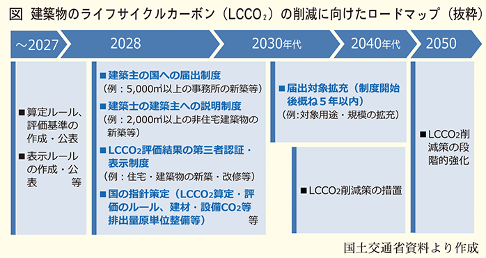 本とりまとめにて検討されたLCA制度のうち、建築主の国への届出制度やLCCO2評価結果の第三者認証・表示制度などは2028年度からの開始が想定されています。その後、2030年代に届出対象の拡充、2050年頃にLCCO2削減策の段階的強化が目指される方針です(図)。