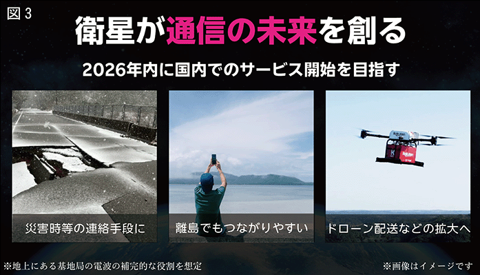 こうした現状を打破すべく、私たちが取り組んでいるのが「Rakuten最強衛星サービス」です(図3)。宇宙に打ち上げた低軌道衛星と市販のスマートフォンを直接つなぎ、高速インターネット通信を実現するプロジェクトです。この「第二のアポロ計画」とも呼ぶべき挑戦が結実すれば、山間部や離島、海上など、従来は圏外だったエリアでも、専用端末なしでスマートフォンが利用可能になります。これは、災害時の安否確認を容易にし、多くの命を救うことにもつながります。2026年第4四半期の国内サービス開始に向け、現在準備を進めています。