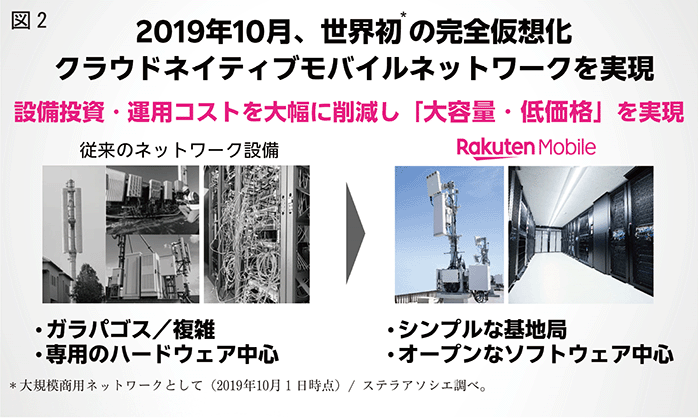 携帯キャリア事業には、他のインターネットビジネスと大きく異なり、周波数という有限な資源の割り当てに加え、莫大な投資を要する基地局インフラの整備が必要となります。周波数の割り当てについては、市場競争を促す観点から、総務省より認可をいただくことができました。課題は、基地局の構築でした。大容量かつ低価格による「携帯事業の民主化」を実現するために、従来の複雑な運用手法を根底から変える必要があると考えました。そこで私たちが挑んだのが、基地局ごとに設置された特定メーカーの専用ハードウェアに依存した従来の仕組みでなく、すべての機能をソフトウェアに置き換える「完全仮想化クラウドネイティブモバイルネットワーク」の導入です。これにより、汎用ハードウェアが利用可能となり、設備投資や運用コストの大幅な削減につながりました(図2)。一見簡単に聞こえるかもしれませんが、ガソリン車から電気自動車への革命を超えるチャレンジだったと思っています。携帯電話の通信を支える信号処理には、凄まじい計算量が求められます。音声通話や高画質動画の視聴、決済インフラとしての即時性など、何千万ものユーザーによる通信データをリアルタイムで制御し、かつ強固なセキュリティを維持しなければならないからです。