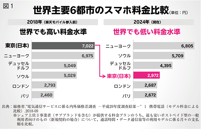 特に、日本の携帯料金は、世界的に見ても高過ぎると感じていました。実際、楽天グループ参入前の2018年時点での東京におけるスマートフォン利用料金は、一人当たり7,022円と主要都市の中でも高い水準でした。こうした状況を受け、料金水準を下げるために挑戦し続けた結果、2024年には一人当たり2,972円まで低下しました(図1)。当社の試算によると、「楽天モバイル」の参入が日本の消費者物価指数の抑制に働き、約4兆円が家計に還元されたことになります。物価の低下が必ずしも経済にとってプラスになるとは限らないものの、インフラは経済活動の基盤であり、「安くて、早くて、便利なもの」を届ける責任があると考えています。