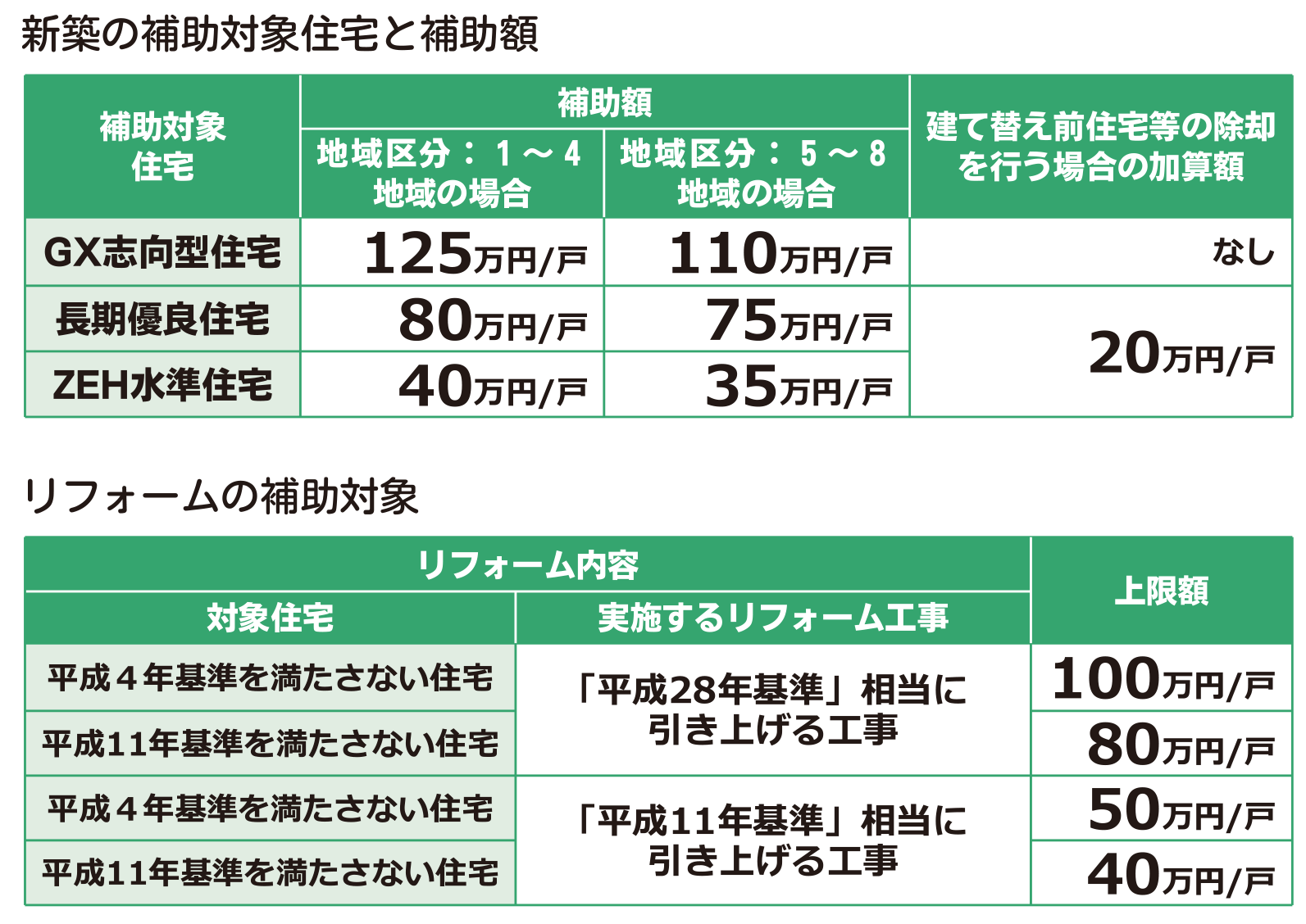 リフォームについては、改修前後の断熱性能等に応じて補助額が決まります。「平成4年基準を満たさない」または「平成11年基準を満たさない」住宅を対象に、「平成28年基準相当」に引き上げる工事に対し、一戸当たり最大100万円が補助されます。