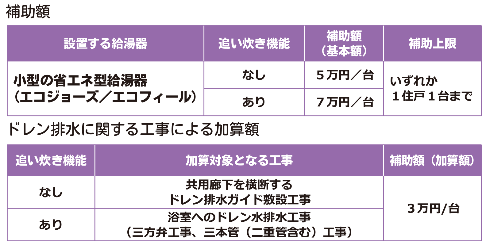 賃貸集合給湯省エネ2026事業では、1棟に2戸以上の賃貸住戸を有し、建築から1年以上が経過している既存賃貸集合住宅を対象に、従来型給湯器を小型の省エネ型給湯器へ交換するリフォーム工事またはリース利用に支援がなされます。補助額は、性能要件を満たした給湯器のうち、追い炊き機能の有無により基本額が定められています。また、導入と併せて実施したドレン排水に関する工事の内容に応じて額が加算されます。