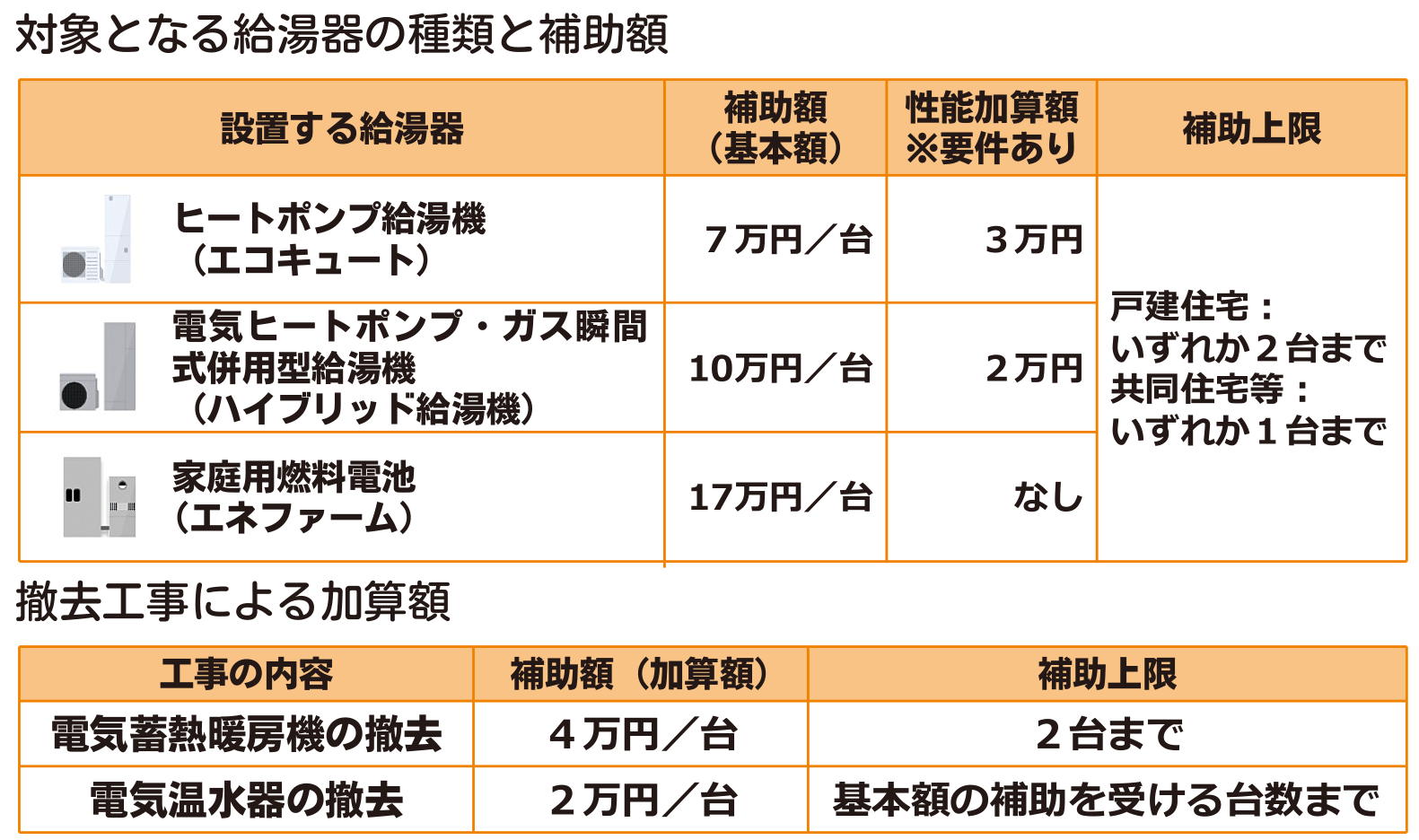 給湯省エネ2026事業では、新築・既存住宅において、一定の性能を満たす高効率給湯器の購入及び導入に向けた工事や、リース利用等に支援がなされます。補助額については、導入する機器の種類に応じて基本額が定められており、1台当たり最大17万円が補助されます。また、給湯器の性能や設置に併せて実施された撤去工事の内容に応じて額が加算されます。補助上限は導入する台数によって制限されており、一戸建住宅は2台、共同住宅等は1台までとなっています。