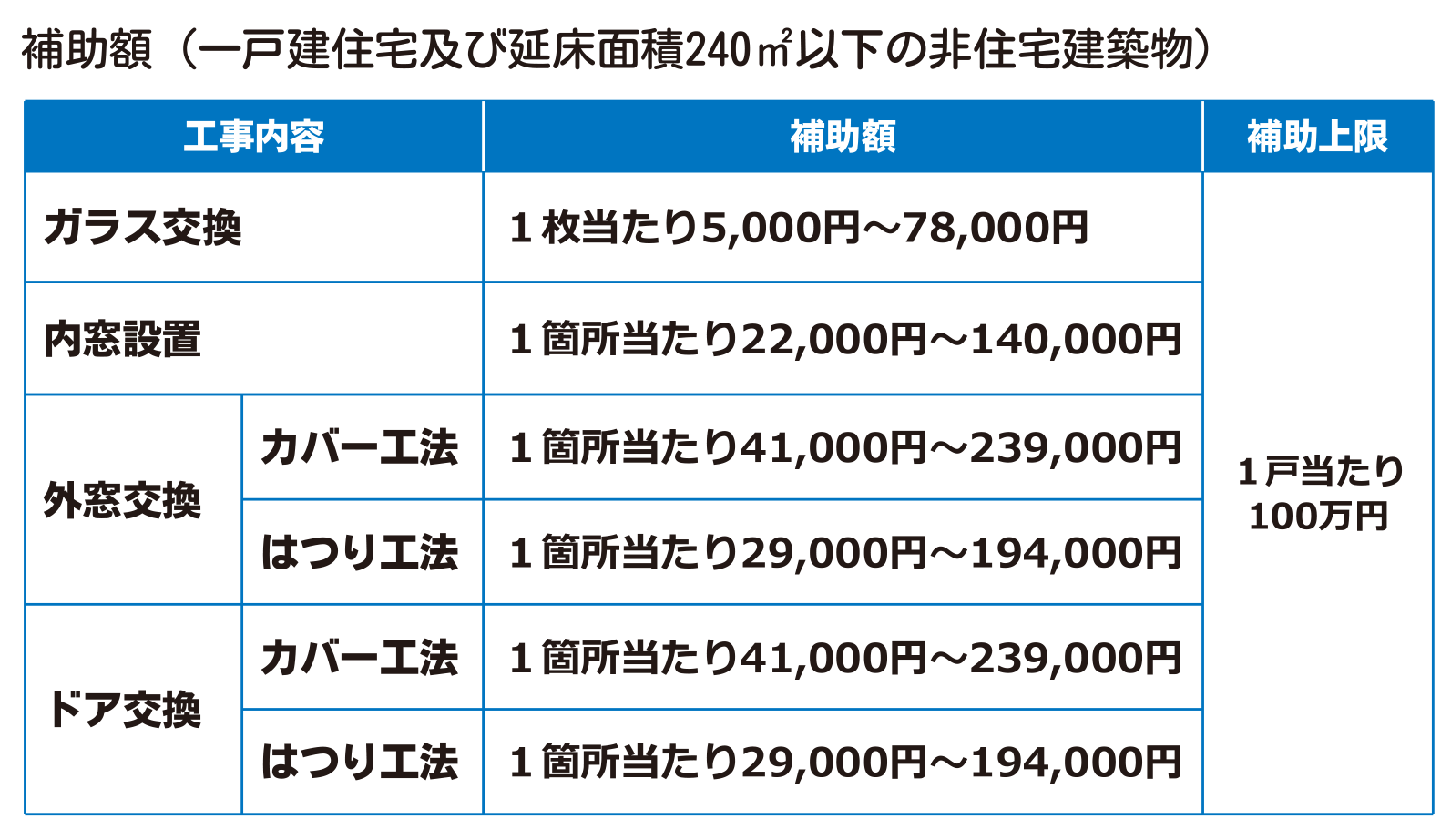 先進的窓リノベ2026事業では、既存の住宅及び非住宅建築物に行う開口部の断熱性能を向上する工事に支援がなされます。ガラス交換や内窓設置などの補助対象工事において、設置する製品の性能や大きさ、設置する住宅の建て方に応じて補助額が定められています。一戸当たりの補助額の上限は、一戸建住宅及び延床面積240㎡以下の非住宅建築物で100万円、延床面積240㎡を超える非住宅建築物で1,000万円となります。なお、10㎡を超える範囲の増築工事に伴って増築部に設置する外窓及びドアは、補助対象とならないことに注意が必要です。