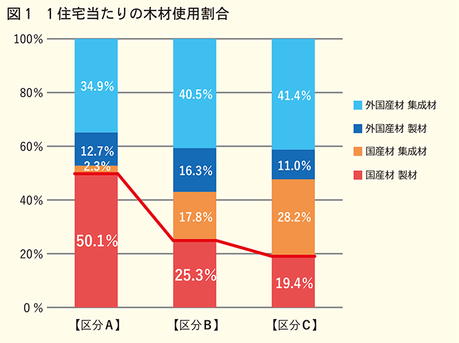 国産材使用比率の調査では、供給規模と材種選定の間には明確な相関関係があることが分かりました。調査結果によると、小規模な「区分A」では国産製材の使用比率が50.1%と半数程度を占めています。これに対して、「区分B」では25.3%、「区分C」では19.4%となっており、供給戸数規模が大きくなるほど国産製材の使用比率が下がっていることが明らかになりました(図1)。