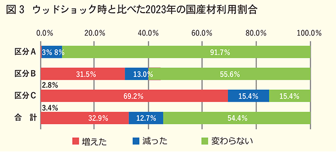 ウッドショックの影響についても分析が行われました。ウッドショック時と比べた2023年の国産材利用割合については、供給規模が大きい企業ほど「増えた」と回答する割合が高く、区分Cでは69.2%に達しました。一方、区分Aでは91.7%が「変わらない」と回答しています(図3)。これは小規模企業が従来の調達ルートの範囲内で対応可能であったのに対し、大量の木材を必要とする大手企業は、外国産材の供給停滞を受けて戦略的に国産材への代替を進めた結果と考えられます。ヒアリングに応じた各社は、価格上昇の影響はあったものの、事業停止に至るような状況には陥らなかったという認識を示しています。その要因として、特定の樹種に固執せず、同等の性能を持つ複数樹種を横断的に使用する設計方針や、自社プレカット工場をバッファとして市況に応じた樹種や断面の調整を迅速に行ったことが挙げられます。現在、国産材は為替リスクや国際情勢に左右されにくく、安定調達が可能な材料として、外国産材を補完する以上の位置づけを確立しつつあります。