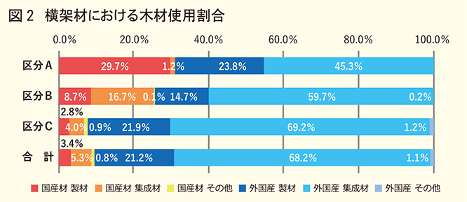 一方で、国産集成材の使用比率は、区分Aで2.3%、区分Bで17.8%、区分Cでは28.2%となっており、供給規模の拡大に伴って上昇しています。この傾向は外国産材に限定しても同様に認められます。この理由として、供給戸数規模が大きくなるほど安定調達・安定品質を実現するために、集成材を採用する会社が増えることが考えられます。部位別で見ると、特に梁や桁などの横架材に関しては、全区分において外国産集成材が主流となっています(図2)。外国産材の採用が多い要因として、高いヤング係数や寸法安定性に加え、品質のばらつきや無垢材特有の反り・割れが少ないといった性能面、更には安定供給という実務的な要件を満たしていることが挙げられています。