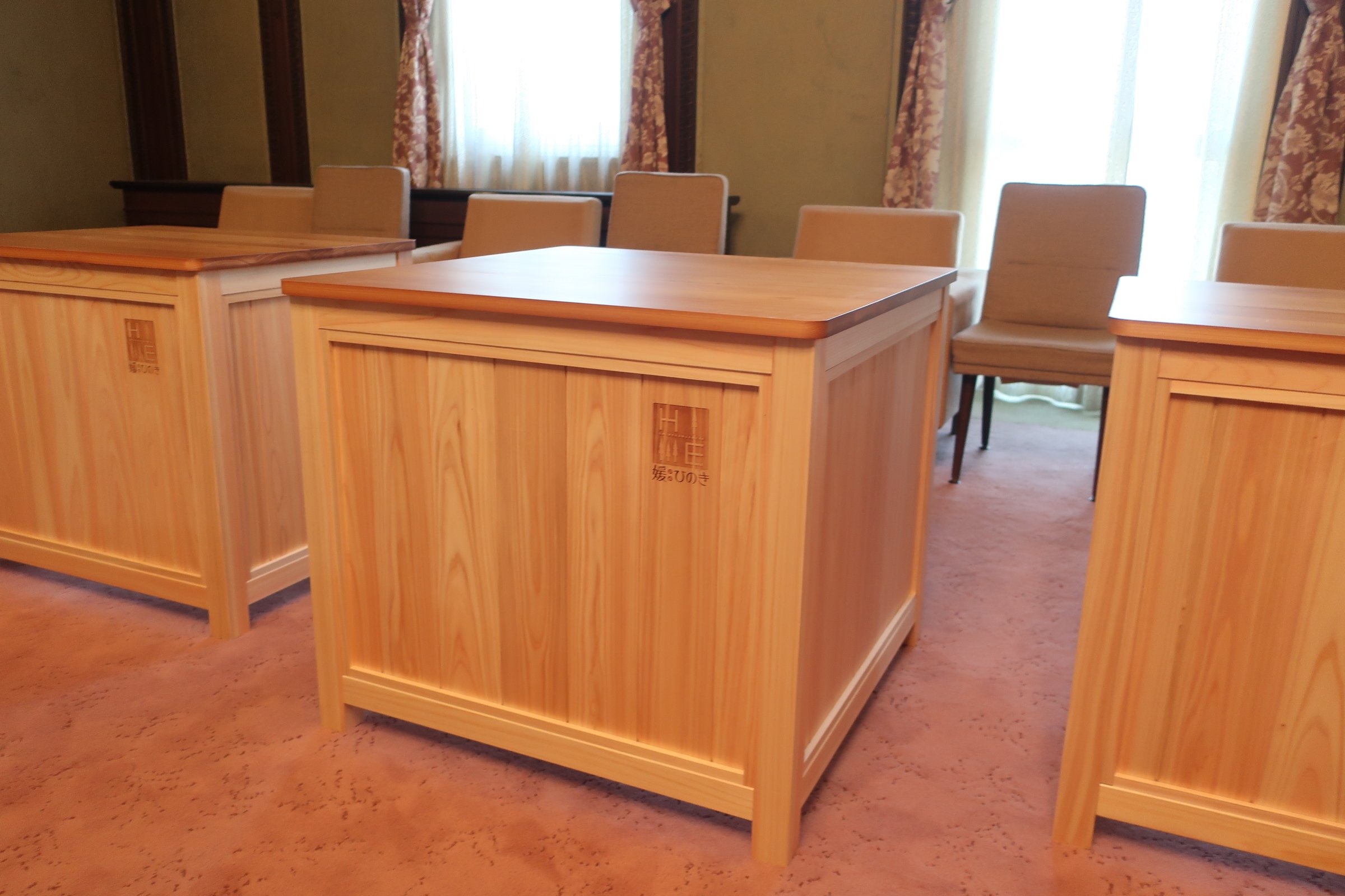 愛媛県庁の会議テーブルに「愛媛県産ヒノキGywood」が採用 記者会見用デスクにも導入、地域材の利用拡大に貢献