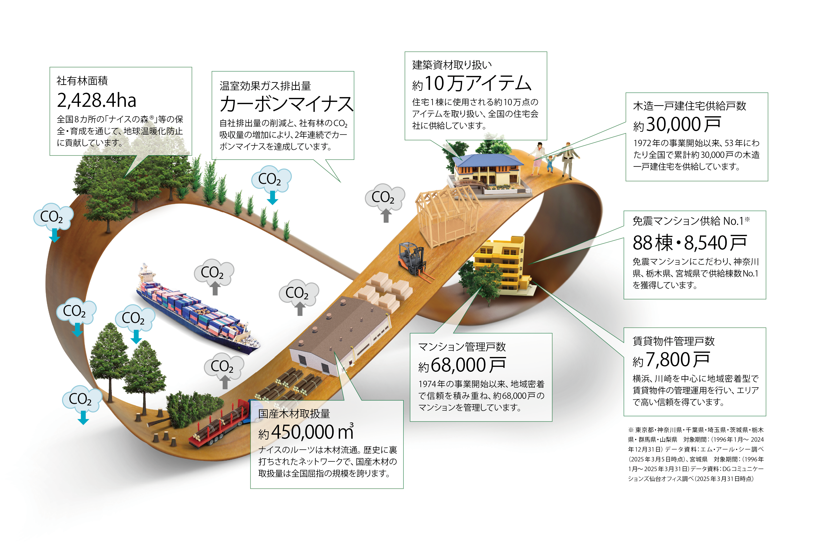 ナイスグループは、「私たちは 信頼を礎に 豊かな住まいと暮らしを実現します」という企業理念のもと、人と環境にやさしい自然素材「木」の普及、地震に強い住まいづくり、健康で快適な居住空間の提供を通じて、企業価値の向上と持続可能な社会の実現に挑戦し続けています。