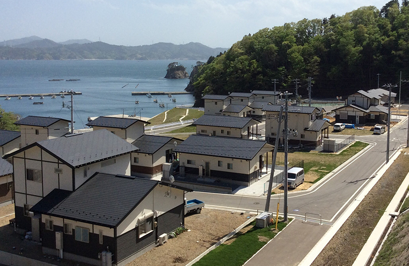 2011年の東日本大震災では、被災地域の方々の安全・安心な暮らしを確保するべく、東北復興に取り組み、震災直後より、宮城県・福島県で合計1,088戸の木造の応急仮設住宅の建設に携わりました。その後、地域の企業様と一体となって、災害公営住宅の建設に携わりました。2016年の熊本地震では、熊本県産材をはじめとする建築資材の供給を中心として、木造の応急仮設住宅や復興住宅に携わりました。